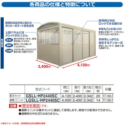 販売条件 ◆詳しくはこちらをご確認ください サイズ 間口:4120(mm) 奥行:2400(mm) 最大高さ:2342(mm) 梱包数:20 容量:17100L 材質 本体・メッシュ パネル/ アルミ押出形材 扉・側面下部パネル・背面下部パネル/アルミ・樹脂複合板 部品/冷間圧延鋼板、亜鉛メッキ鋼板 仕様 ゴミ収集庫/組立式/アンカー式/簡易錠 セット内容 ■ゴミストッカー LL型 上吊引き戸式 基本セット 品番:GSLL-HP2440SC 備考・注意 ※配送には、実働約1ヵ月程度お時間が必要となる場合があります。